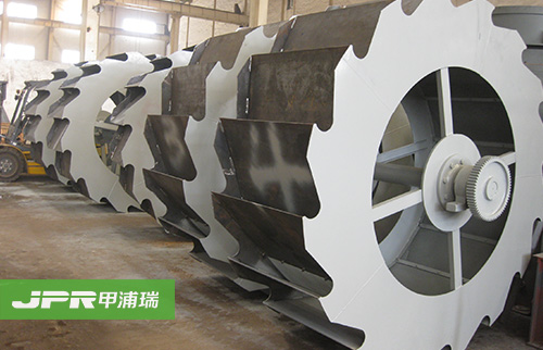 工作時,電機(jī)通過三角帶、減速機(jī)、齒輪減速后帶動葉輪緩慢轉(zhuǎn)動,砂石有給料槽進(jìn)入洗槽中,在葉輪的帶動下翻滾,并互相研磨,除去覆蓋砂石表面的雜質(zhì), 同時破壞包覆砂粒的水汽層,以利于脫水;同時加水,形成強(qiáng)大水流,及時將雜質(zhì)及比重小的異物帶走,并從溢出口洗槽排出,完成清洗作用。干凈的砂石由葉片帶 走,后砂石從旋轉(zhuǎn)的葉輪倒入出料槽,完成砂石的清洗作用。